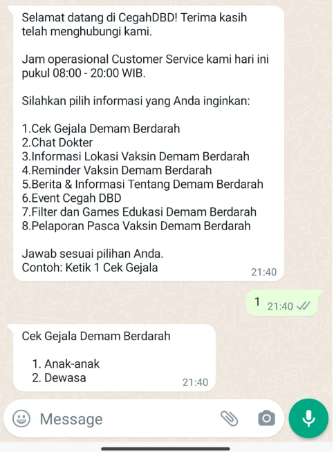 Kemudian, saya memberikan beberapa opsi dan pengguna dapat menjawab dengan nomor yang ada di opsi tersebut. Sebenarnya, ada cara yang lebih baik yaitu dengan free type alias pengguna bisa menjawab dengan mengetik apa yang dia mau.
