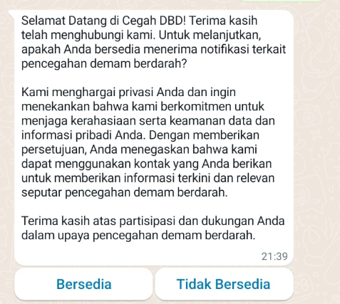 Hal selanjutnya yang saya lakukan adalah menentukan konten apa saja yang bisa dibawa oleh WhatsApp Bot ini. Hal paling utama adalah mendapatkan consent dari pengguna sebelum memulai untuk melakukan interaksi.